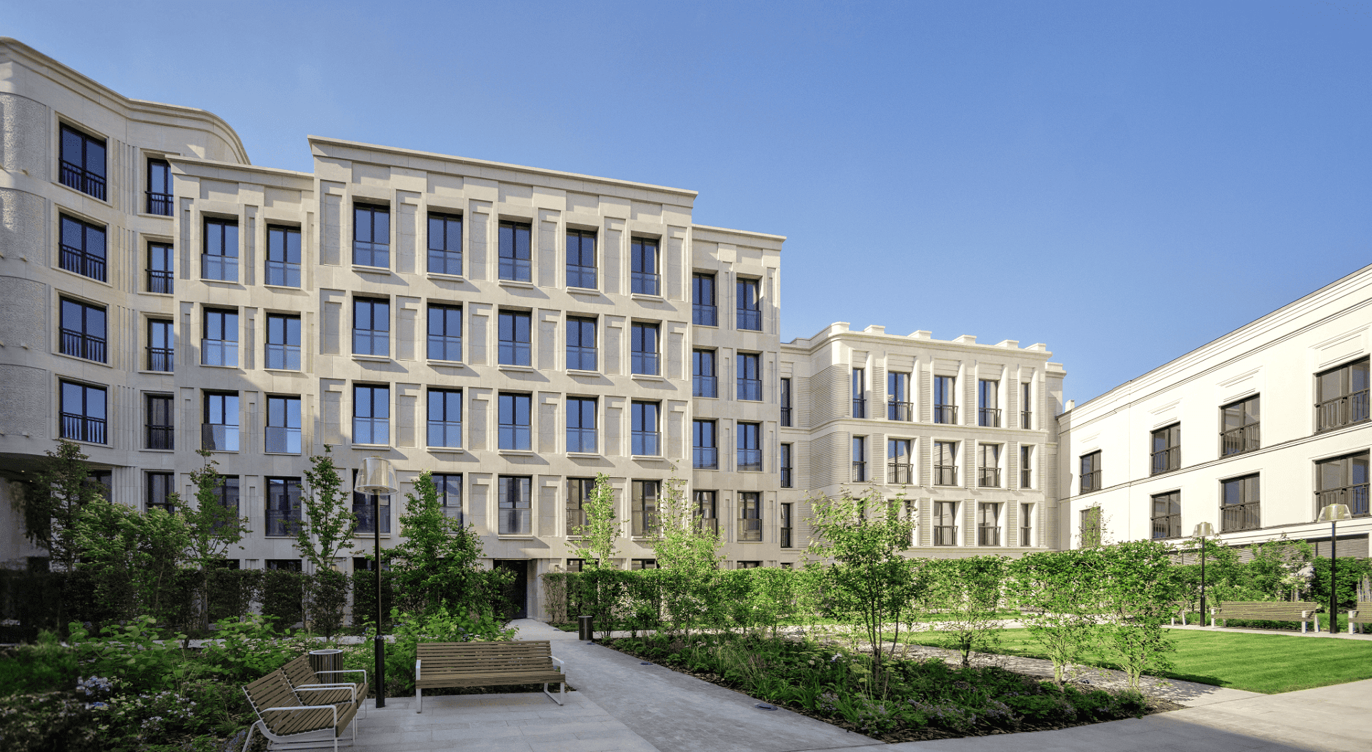Для жителей квартала созданы целые сады, дорожки с мощением из натурального камня и множество площадок для отдыха. Предусмотрены безопасные детские площадки, концепции которых были продуманы до мелочей.
